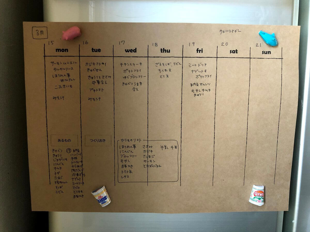 事前に買う物を決めておくと、スーパーで無駄な買い物は減るといいましたが、1週間分の献立を決めておくと更に食費節約には効果的です。