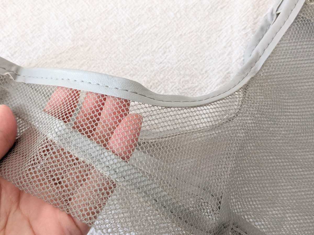 良いなと思ったのが、フチやベルトに使われている生地が革のように柔らかいこと。 メッシュは少しゴワゴワしていますが、この部分は滑らかな肌触りでとても気持ちがいいです。