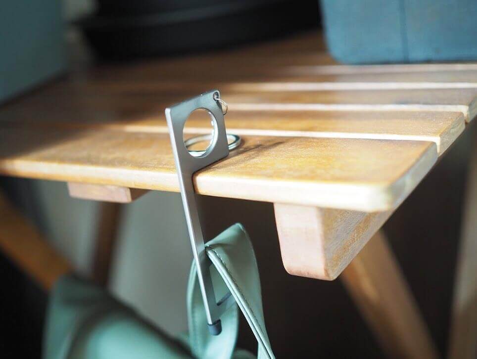 不特定多数の人が触るエレベーターのボタンやATMのタッチパネルなどを、直接触れずに操作できる便利なフックが、バックハンガーとしても使える進化版として登場♪