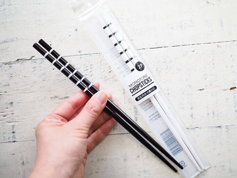 シンプルなモノトーンの竹塗箸は、100均ではまだあまり取扱の少ない「食洗機対応」タイプ。