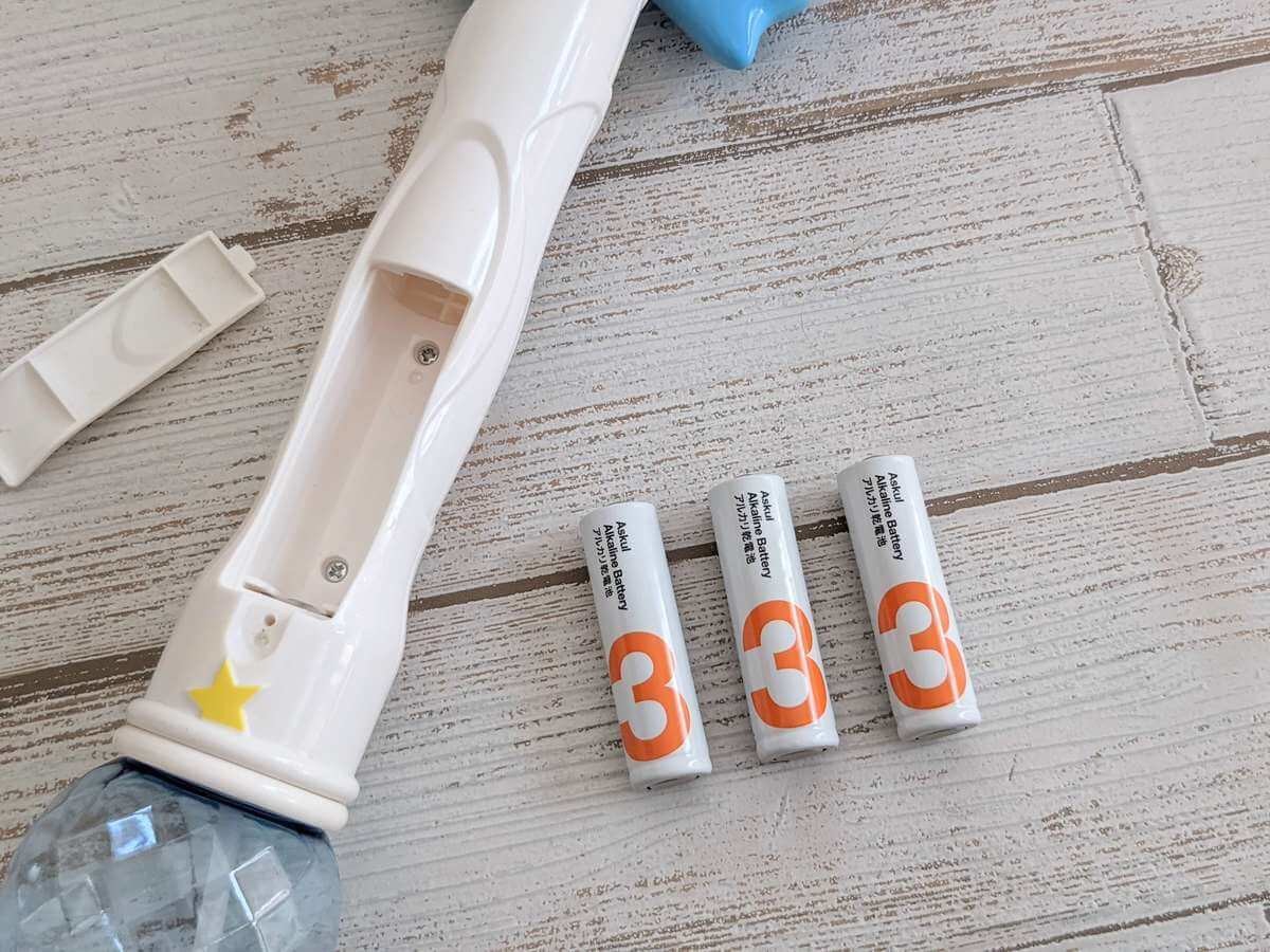 シャボンガン本体+シャボン液がセットになっています。電池は別売りです。 では、さっそく使ってみたいと思います。