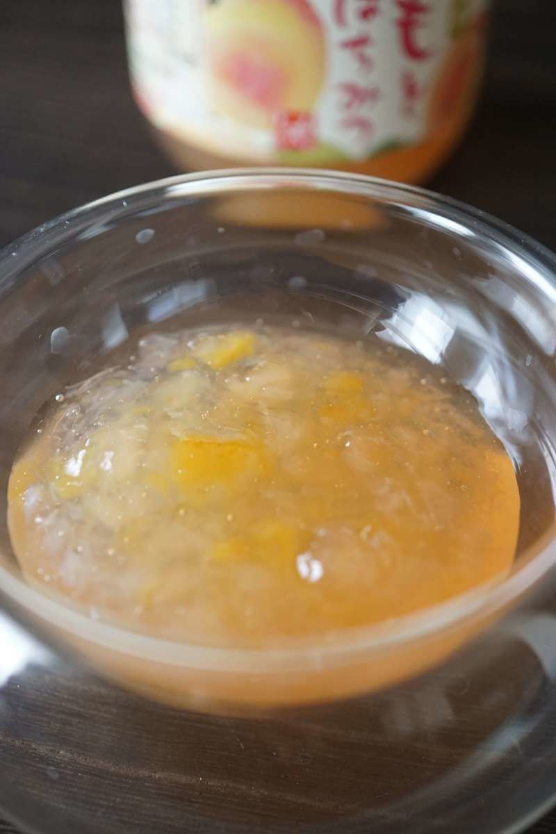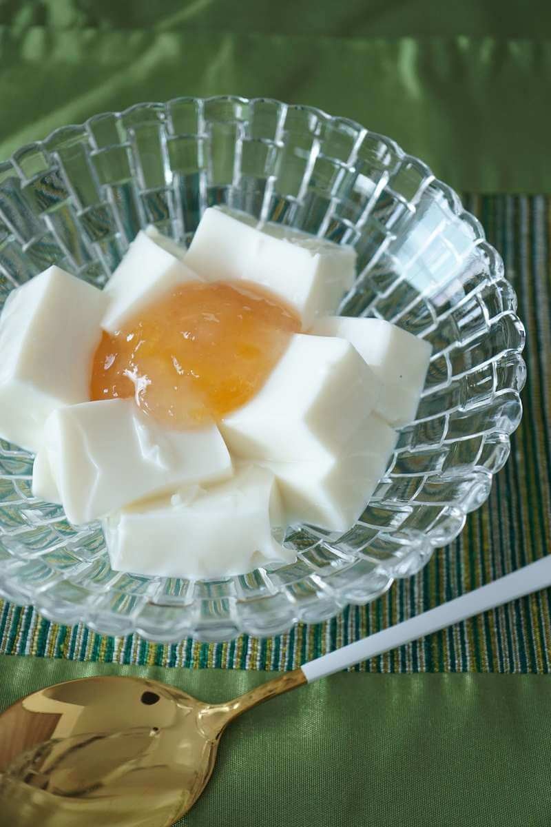 杏仁豆腐を食べやすい大きさにカットして、その上に「ももとはちみつ」をのせるとジャムの酸味が杏仁豆腐の甘さを引き立ててくれます。