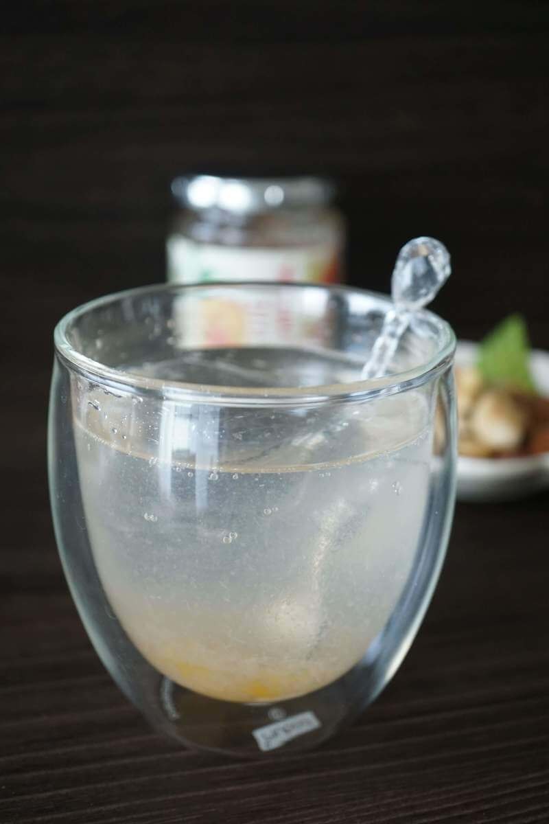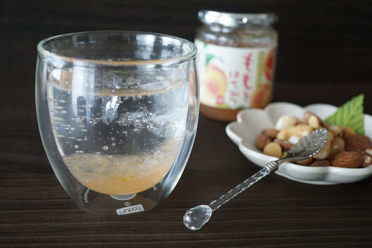 炭酸水180mlに対しジャムを大さじ1入れてみると、ほんのり甘みがついたかなと感じる程度で甘くなりすぎることはありませんでした。