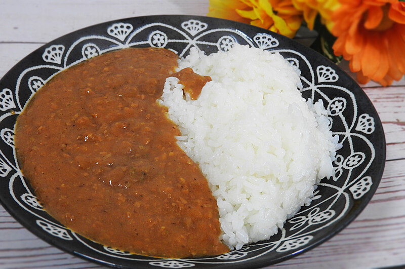 カレーはわりとサラサラしています。耐熱容器にうつすときに、ドバドバと出やすいので注意。