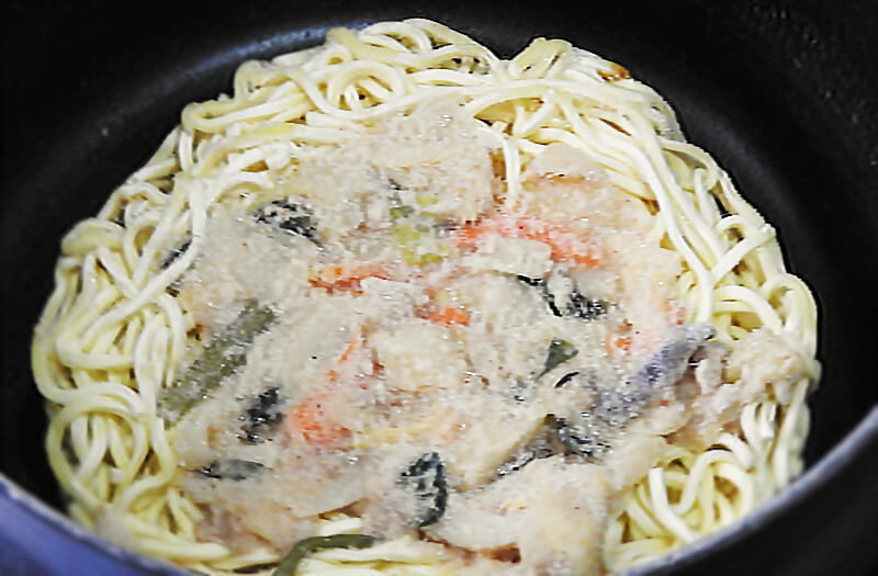 鍋調理なのでやや手間がかかる気がしますが、ふくろから具がのっている麺を取り出して、そのまま鍋にぽーんと入れるだけ。水はいりません。最初は弱火で、スープがとけたら中火にしてぐつぐつ煮立ったら完成です。加熱時間は約7分。