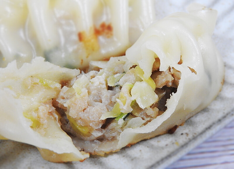 キャベツと豚肉がたっぷり入っており、味は薄め。私は好きな味でしたが、にんにくやしょうがたっぷりの餃子を好む人には物足りないかもしれません。