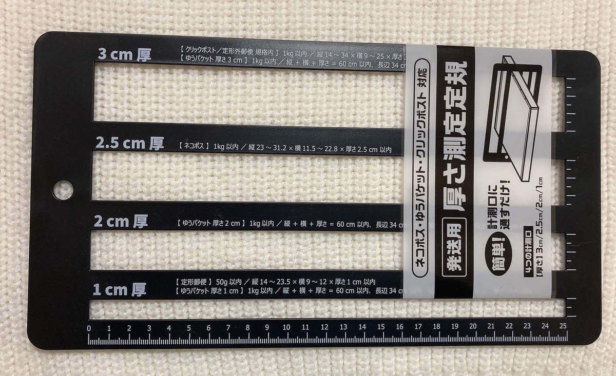 この定規で厚さをきちんとはかれば、「予想以上に送料がかかっていた!」なんて事態も防げます。