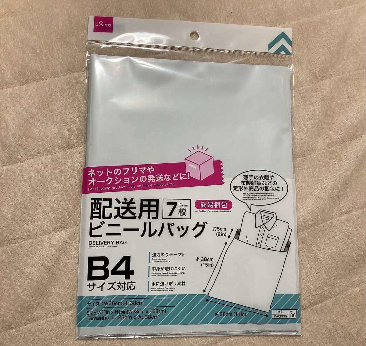 3つ目は「配送用ビニールバッグ(7枚入)」。幅28cm×高さ38cmのB4サイズに対応しており、薄手のシャツなどの衣類を送る際に便利です。