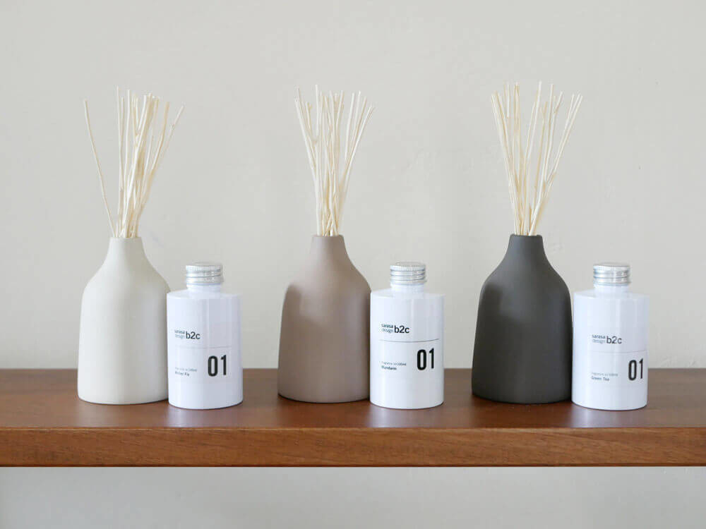 ベース(器)、フレグランスオイル100ml、シダ製リードの3点セットなので、届いたらすぐに使えるスターターセット。 フレグランスオイルは3種類からお選びいただけます。