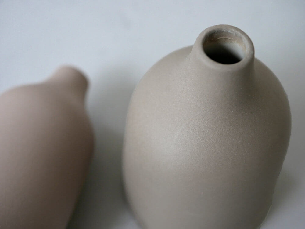 器はセラミック製。 素焼きのようなざらっとした質感がナチュラルな雰囲気。下部はどっしりと安定し、ちょこんとした口部がなんとも愛らしい器。