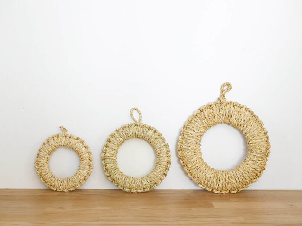 丸く編み込まれた和む輪っかのデザインは、ワラの素材感が一層引き立てられ、またいつもの日用品とも好相性なシンプルなルックス。