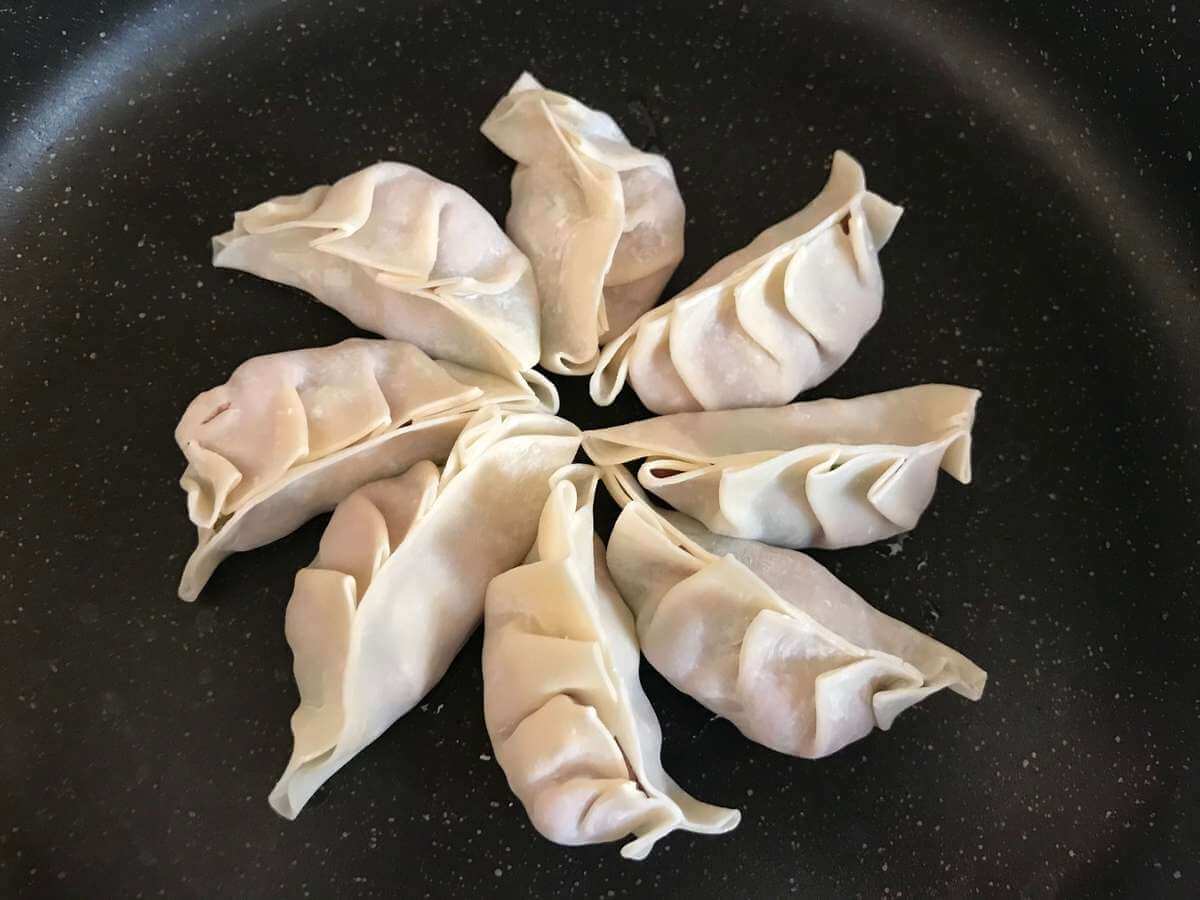 「羽根つき餃子」焼き方①放射状に餃子を並べて、強火で焼く