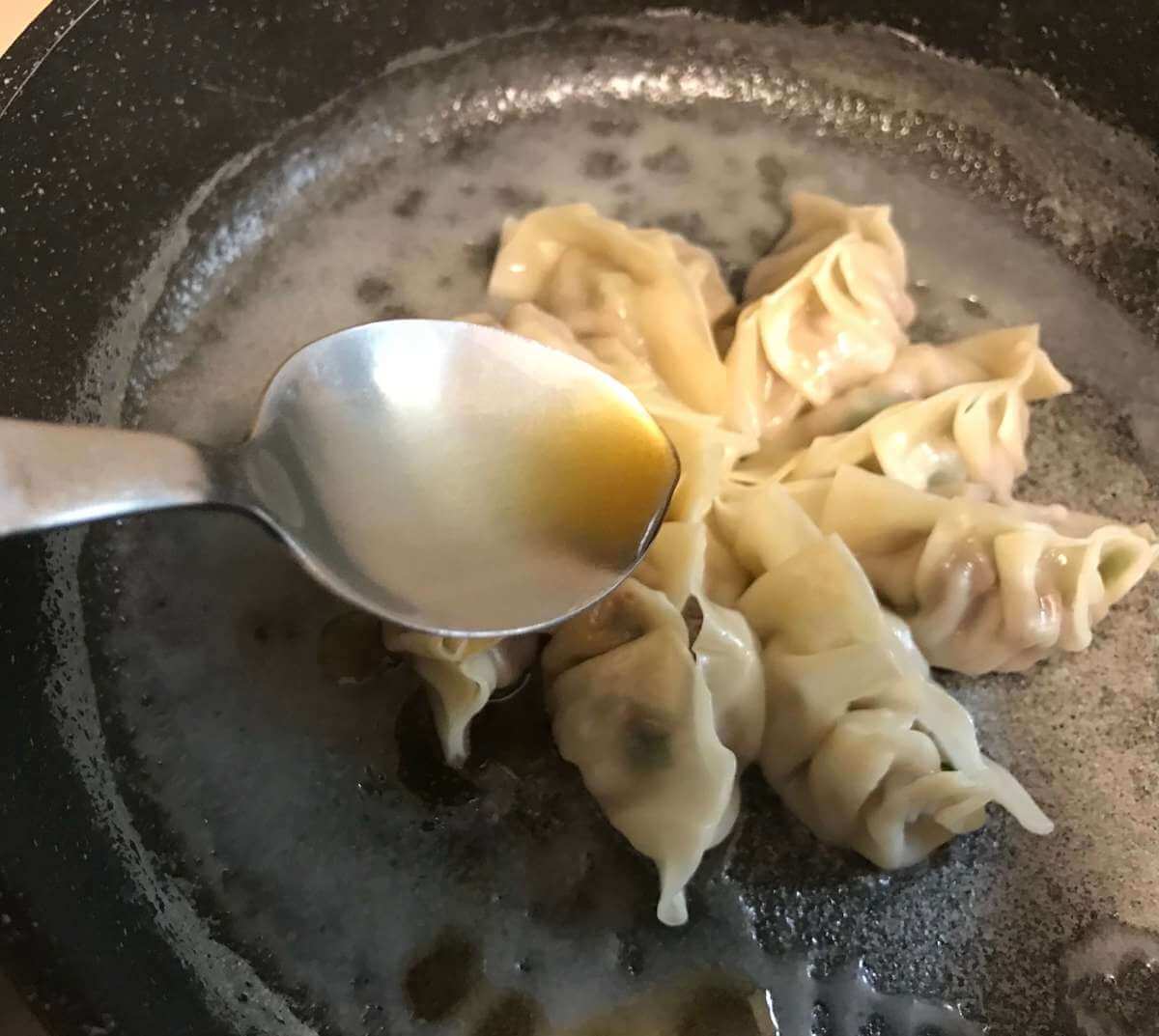 水気がなくったら、ごま油を餃子の上にまんべんなく加えました。ごま油を足すことで、表面がコーティングされ、パリパリ食感になります!