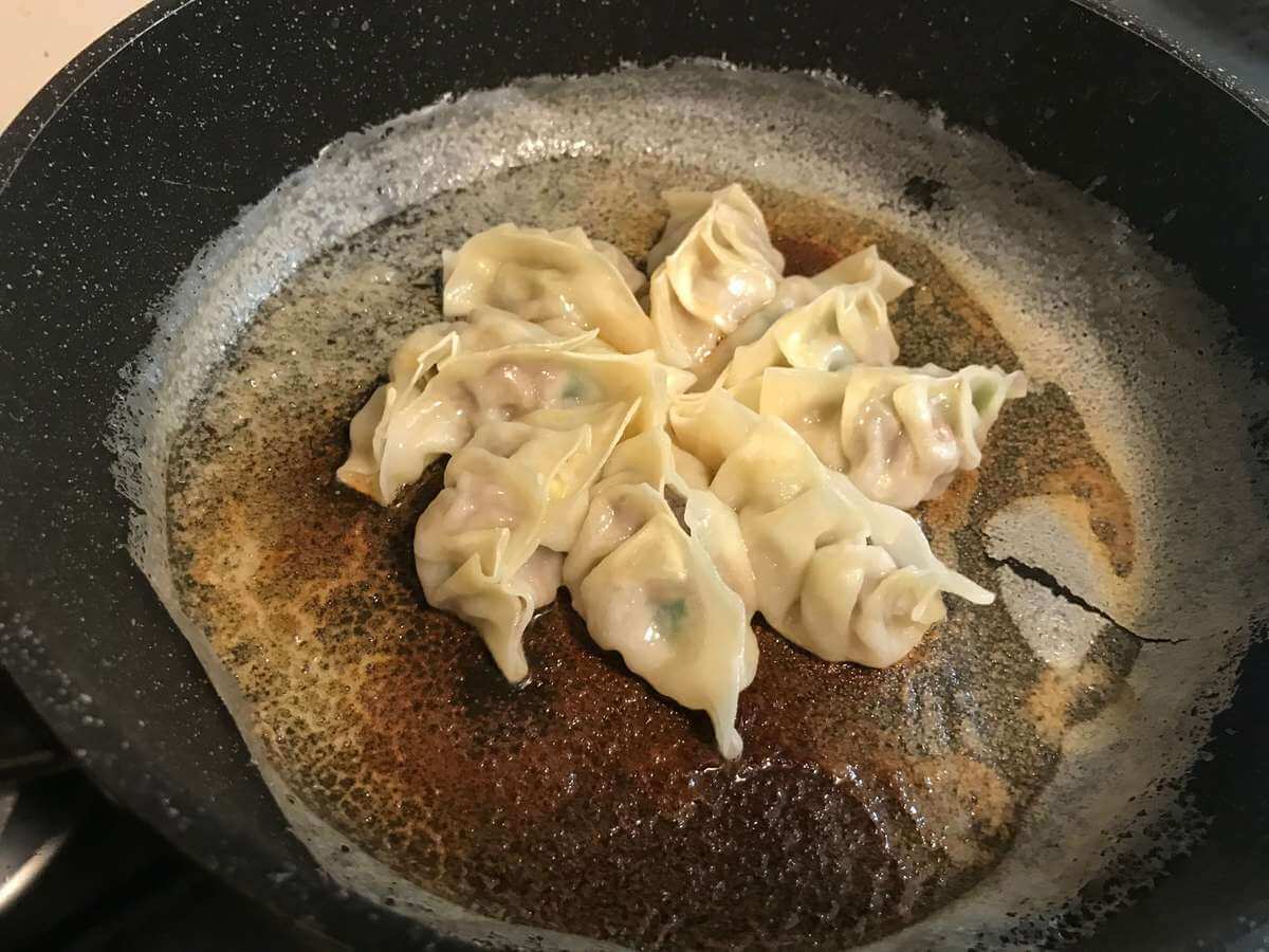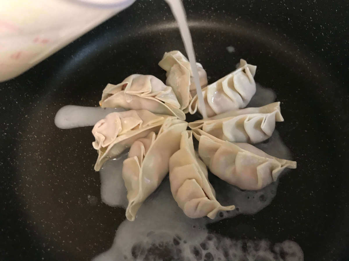 餃子に焼き目がついたら、下準備で作った小麦粉水を餃子にまんべんなく加えます。ジュワジュワ~といった音が鳴りました。