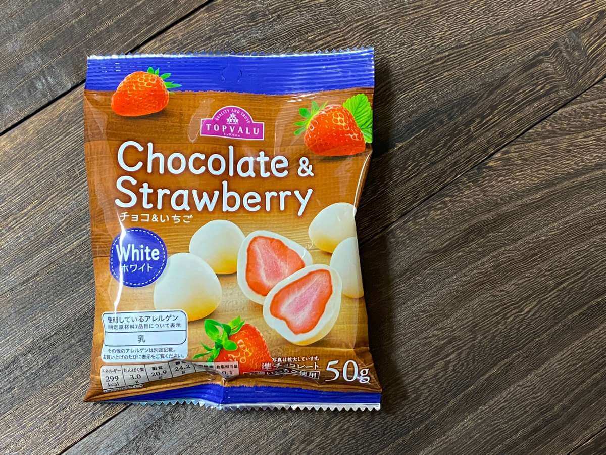 頑張った日の「ご褒美スイーツ」としてオススメなのが、TOPVALUの「チョコ&いちご ホワイト 50g 213円(税込)」です。