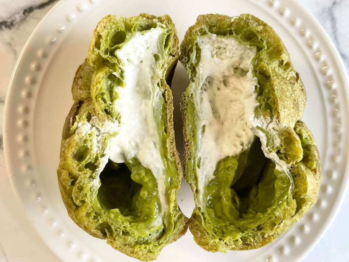 シュー生地は抹茶が練り込んであるので、薄緑色をしています。