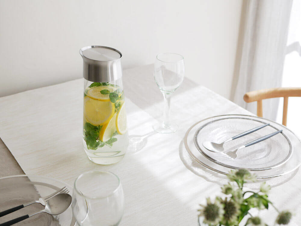 ミネラルウォーターや麦茶などを入れるのにピッタリの「ウォーターカラフェ」は、用途に合わせて2サイズからお選びいただけます。