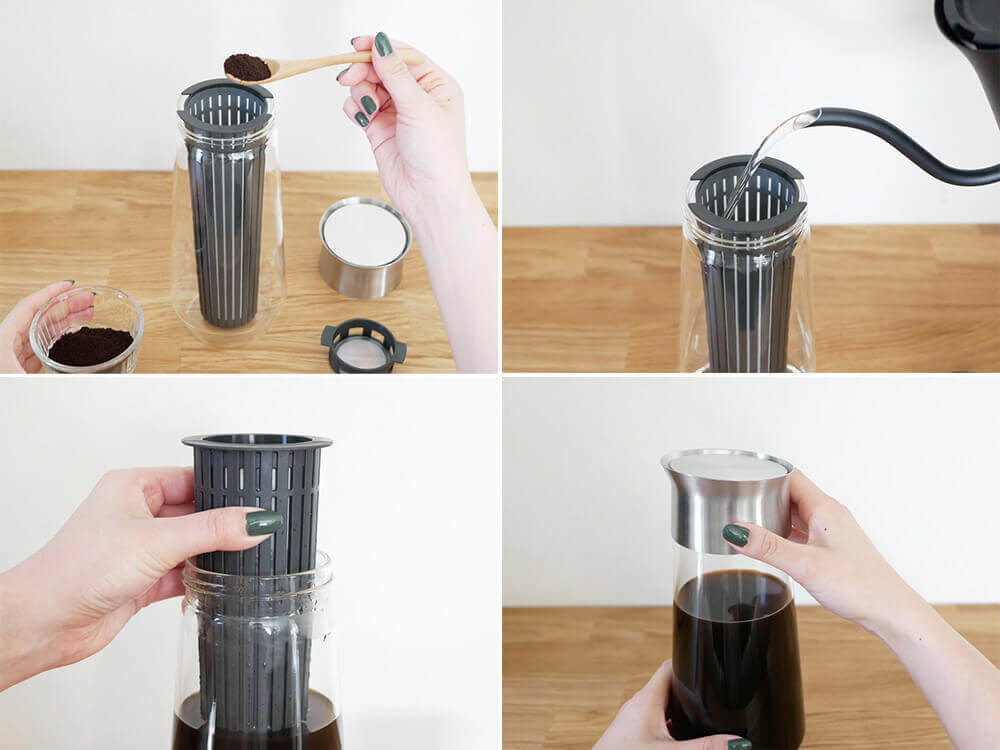 「コールドブリューカラフェ」は、付属のフィルターにコーヒーの粉や茶葉を入れて水を注ぐだけで、水出しのコーヒーやティーを手軽に作ることができます。