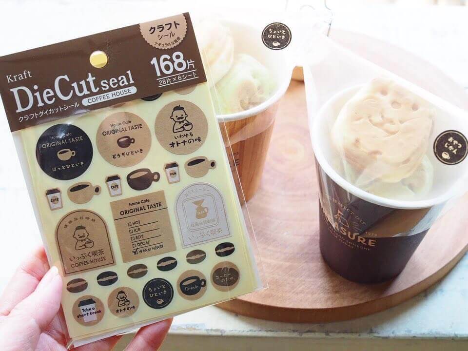 コーヒーカップやメニューボード柄がかわいいカフェ風シールは、「セリア」のクラフトダイカットシールを使用しています。