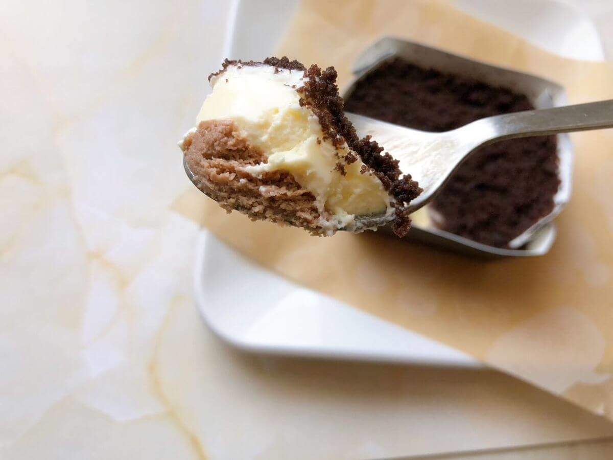 上にたっぷりかかっているのはココアのスポンジクラム。その下には、北海道産マスカルポーネチーズのレアチーズムース、一番下にはデンマーク産クリームチーズとチョコレートのベイクドショコラチーズケーキと贅沢な3層スイーツです。