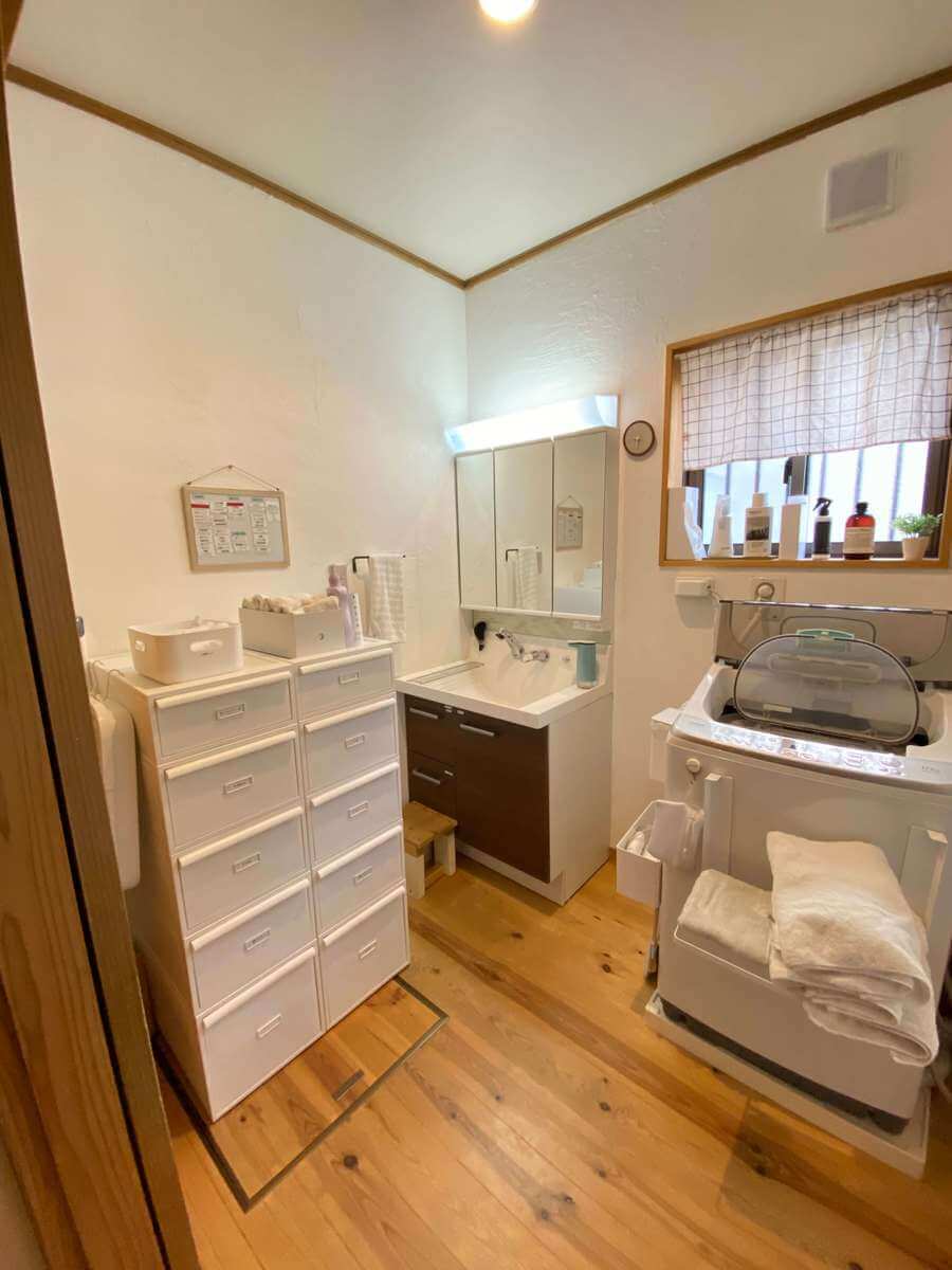 1階のリビングや脱衣所にタオルや寝巻き、仕事着、下着類、子どもたちのオンシーズンの衣類を収納しています。