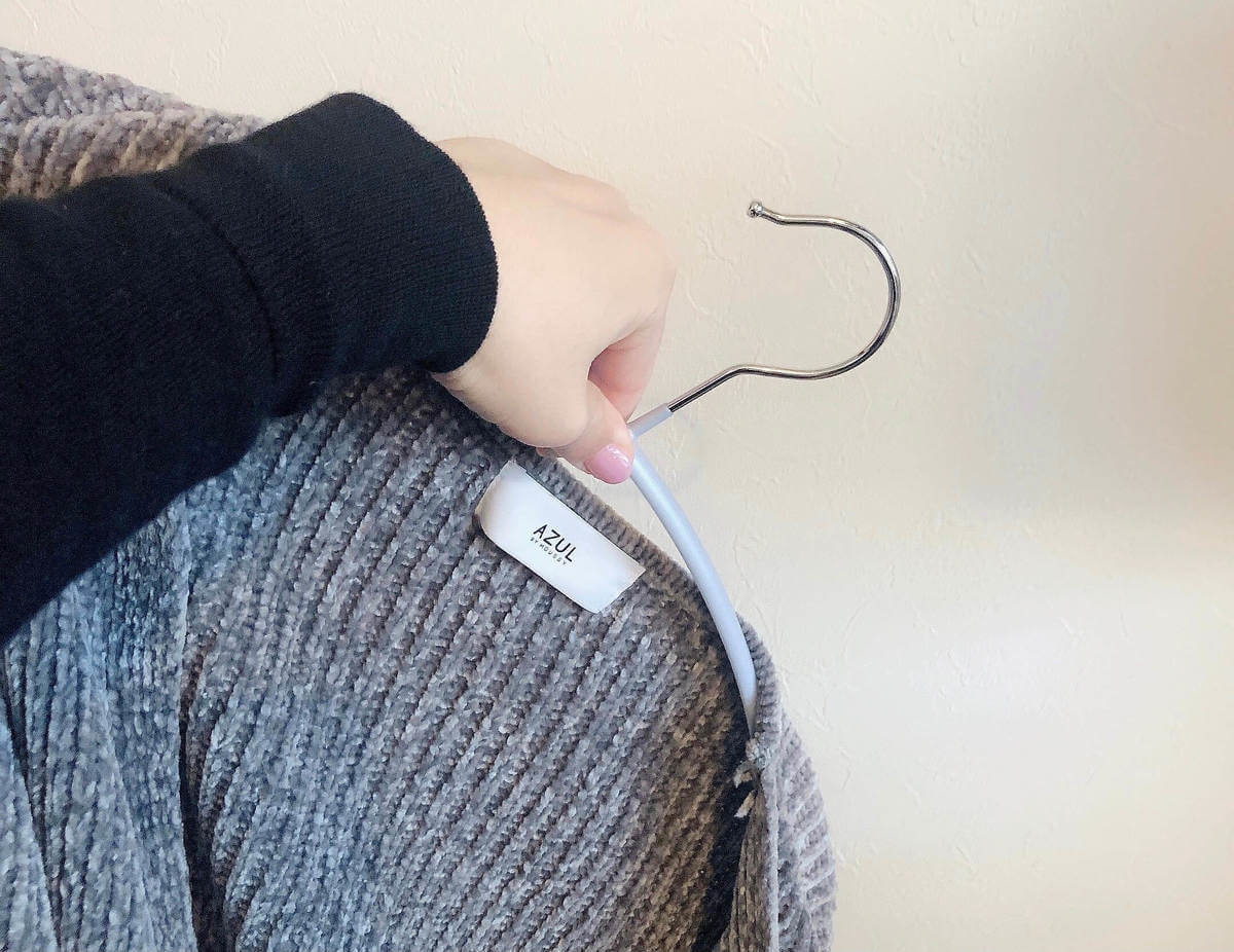 ニットカーディガンも試してみました。コチラも滑りませんね!基本ニットは、ハンガーに掛けると伸びやすいので一時的、または秋冬のみ掛けるだけならアリだと思います。