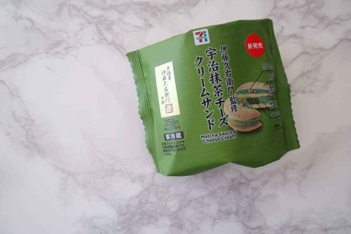 新作! セブンイレブン《宇治抹茶チーズクリームサンド》258円。 伊藤久右衛門監修です。