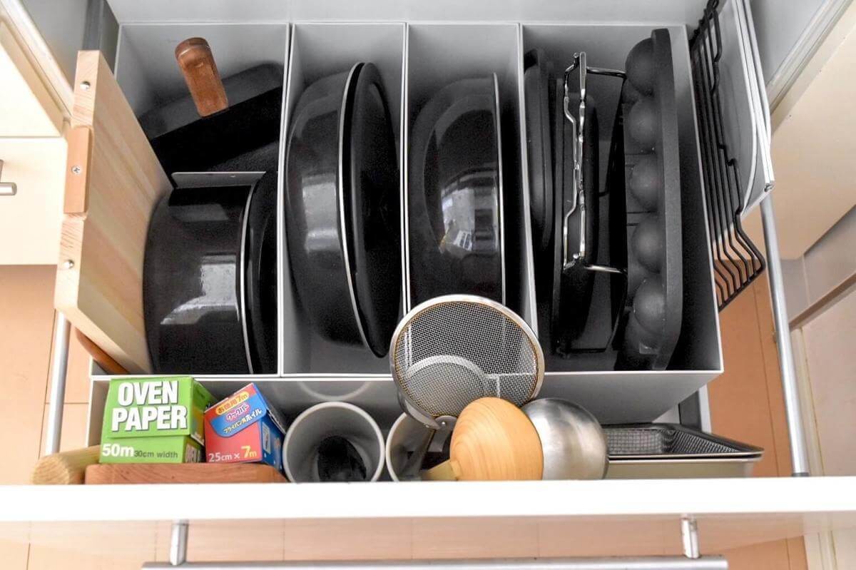 コンロ下ではファイルボックスを並べて、フライパンや鍋、グリルのプレートなどを立てて収納。