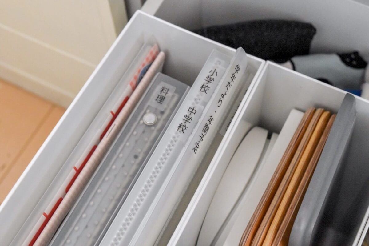 中にはレシピや子どもたちのお便り、トレーやペーパーナフキンなどを収納しています。