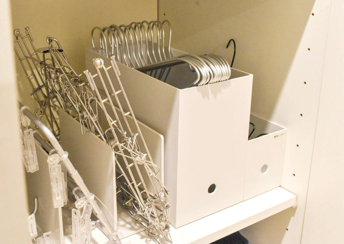 こちらには洗濯ハンガーを収納。斜めに入れることでハンガーを取る際取り出しやすくラクです。