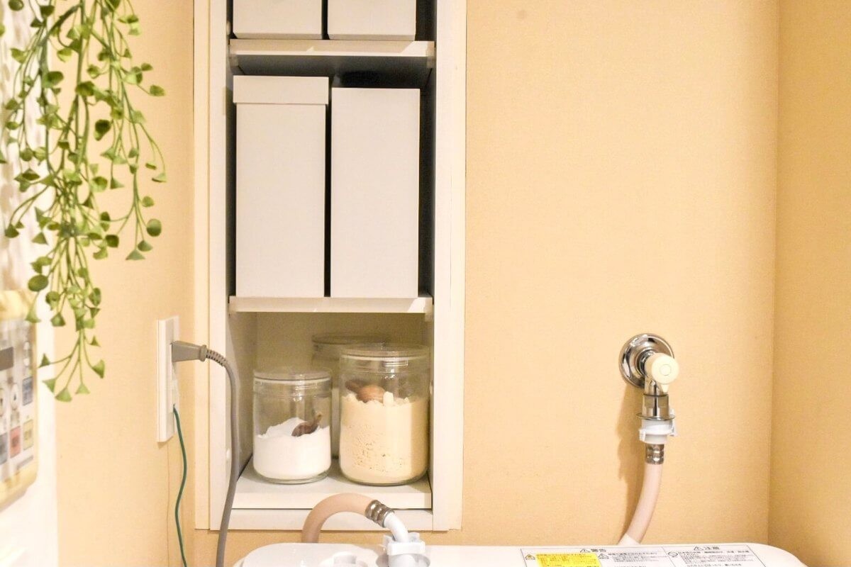 洗面所には洗濯機があり、周辺の収納スペースにもファイルボックスを使っています。