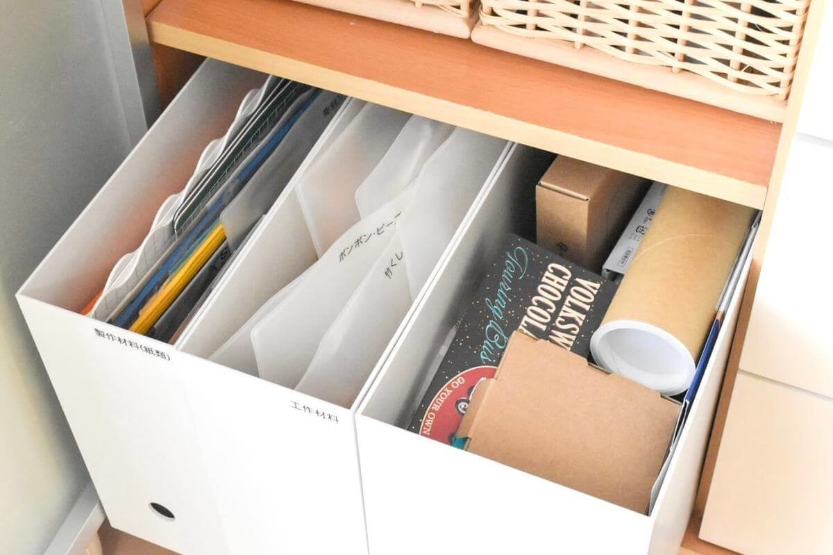 子どもが使う工作グッズも、ファイルボックスを使ってまとめています。