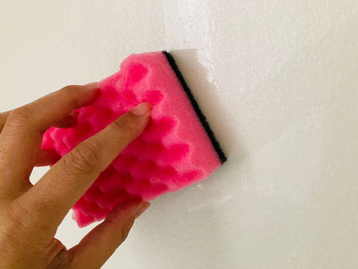 貼り付ける場所を、スポンジや霧吹きで十分に濡らしていきます。貼り付け途中で乾いてしまうと貼りにくくなるので、しっかりと濡らすのがコツです。
