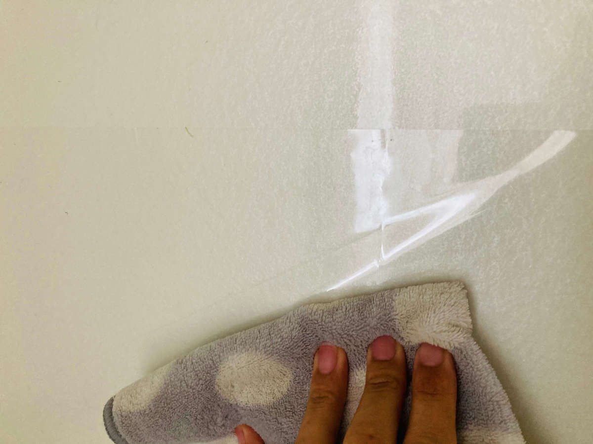 乾いた柔らかい布で、表面のシワや気泡を押し出していきます。私は全て貼ってしまいましたが、貼りながら布で拭いていくとよりきれいに仕上がりますよ。