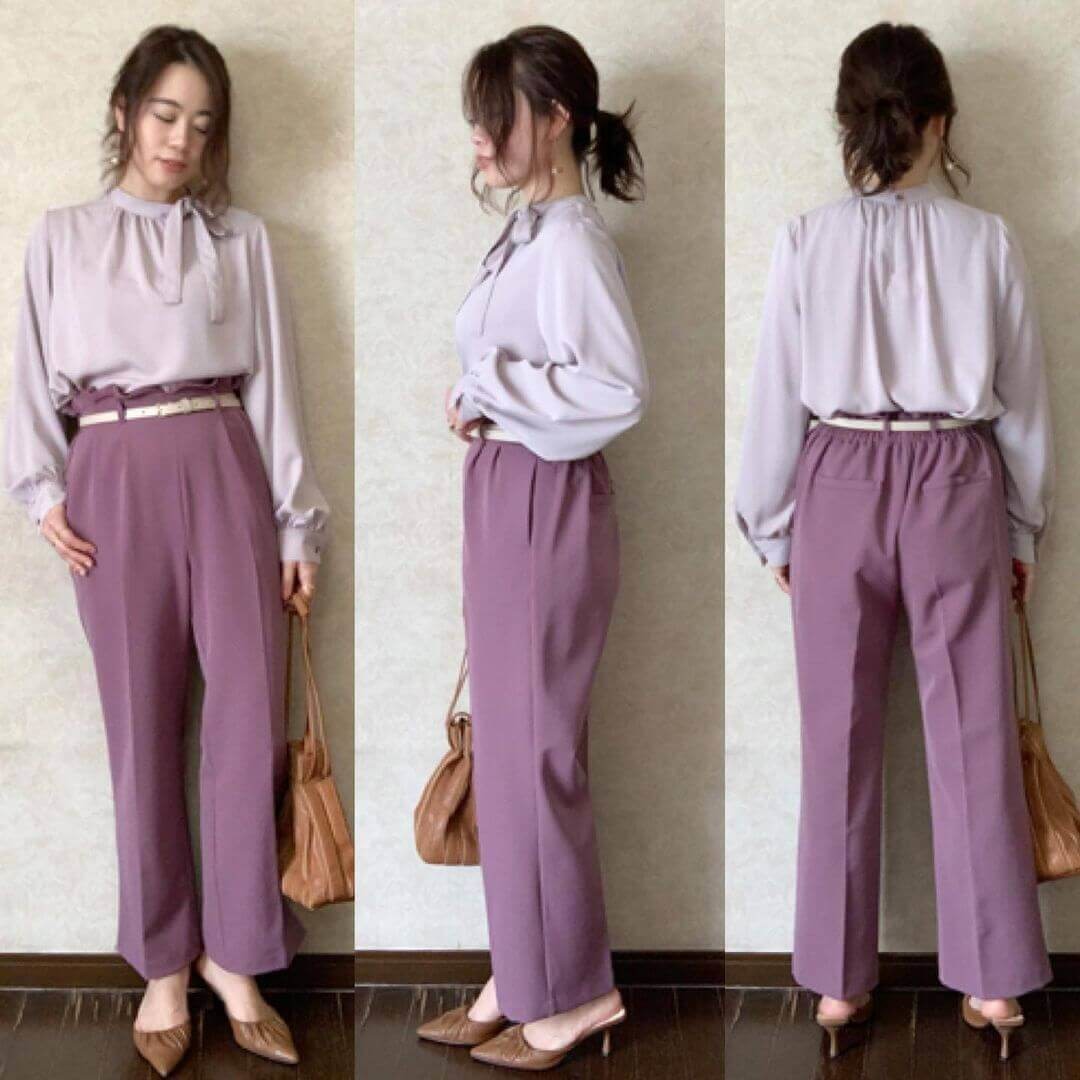 シーズンレスで使いやすい淡いパープル色のパンツが、フェミニンな印象を引き出してくれそうです。