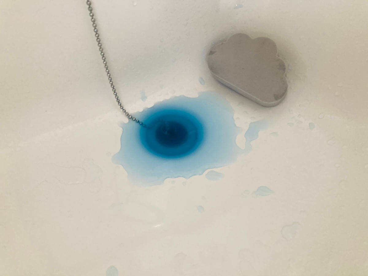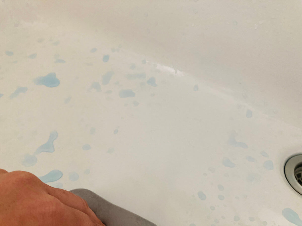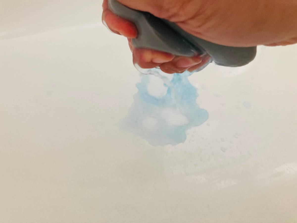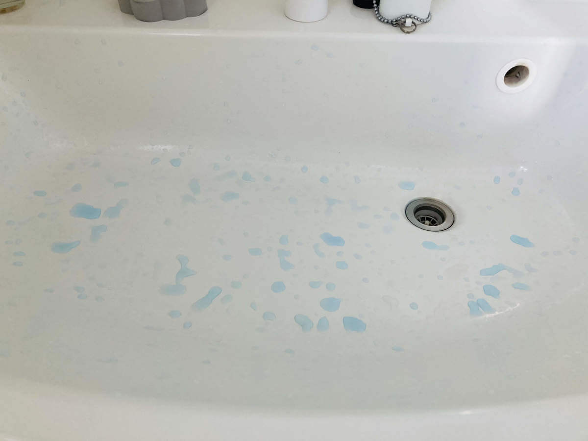 洗面台をわざと濡らして使用感を試していきます。今回はより水滴が目立つように、水彩絵の具の青色を混ぜました。