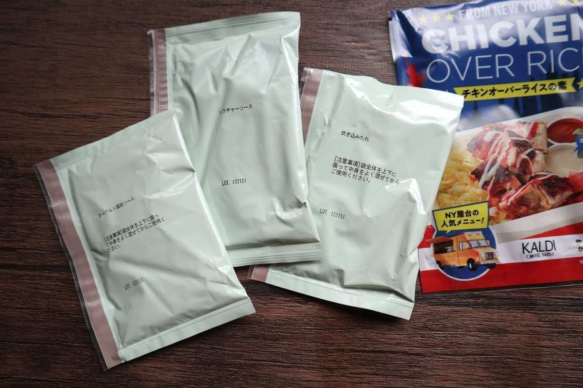 内容は、炊き込みたれ、シラチャーソース、ヨーグルトソースです。