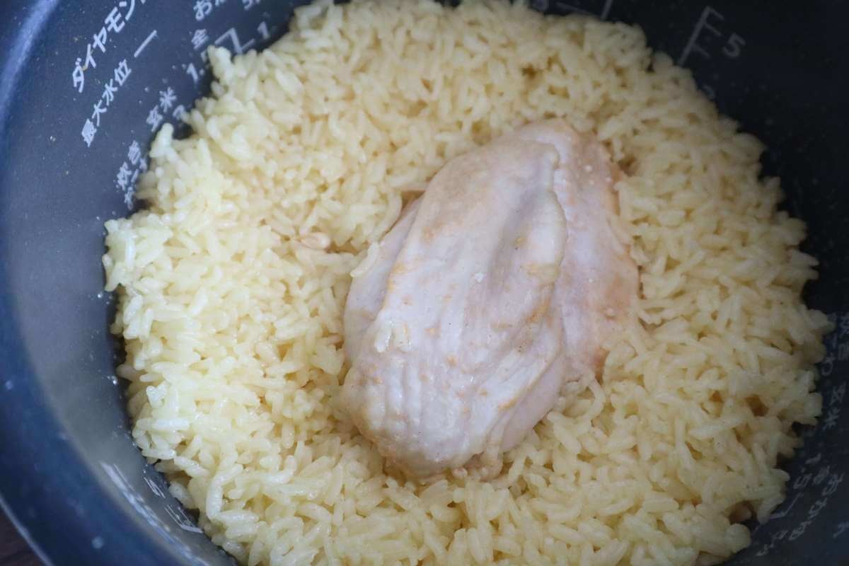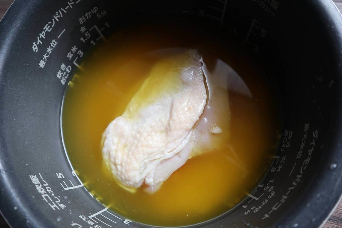 1.お米を洗い炊飯器にセット、お米に合わせた水、炊き込みたれ1袋を加えて混ぜる。鶏むね肉をくわえて、炊飯する。
