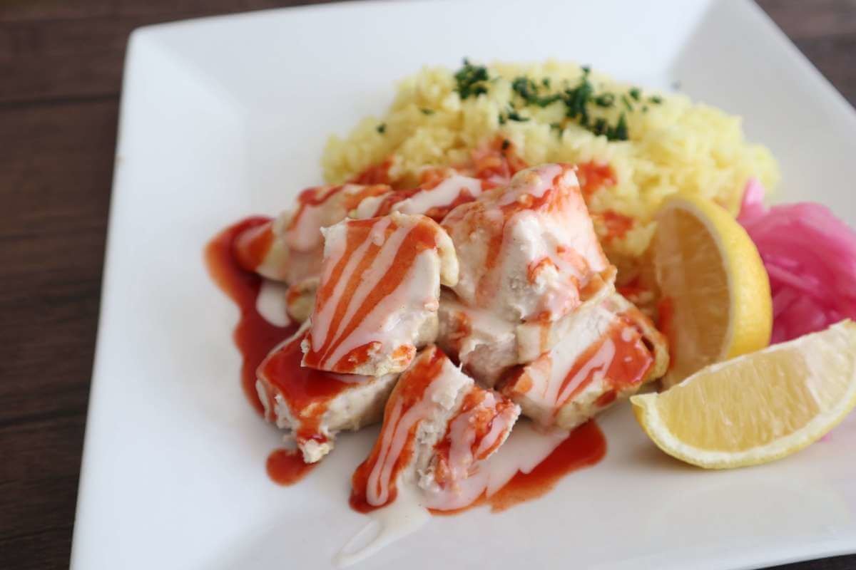 にんにくや魚醤、チキンエキスなどが入った炊き込みたれを吸ったご飯は旨みたっぷりです。チキンにかけたシラチャーソースは、結構辛めですがヨーグルトの爽やでまろやかなソースと合わさると絶妙な味わいに!