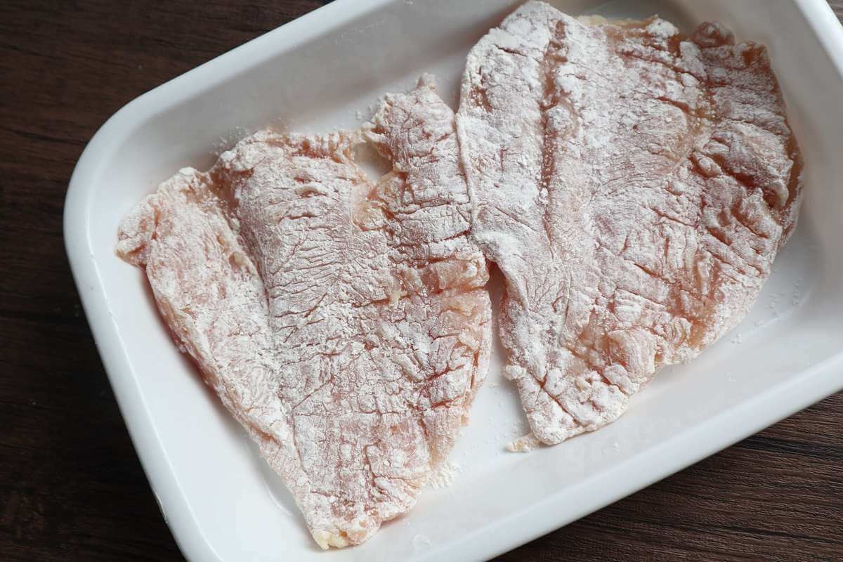 1.鶏むね肉は観音開きにして、包丁の背でたたき、薄力粉をまぶす。