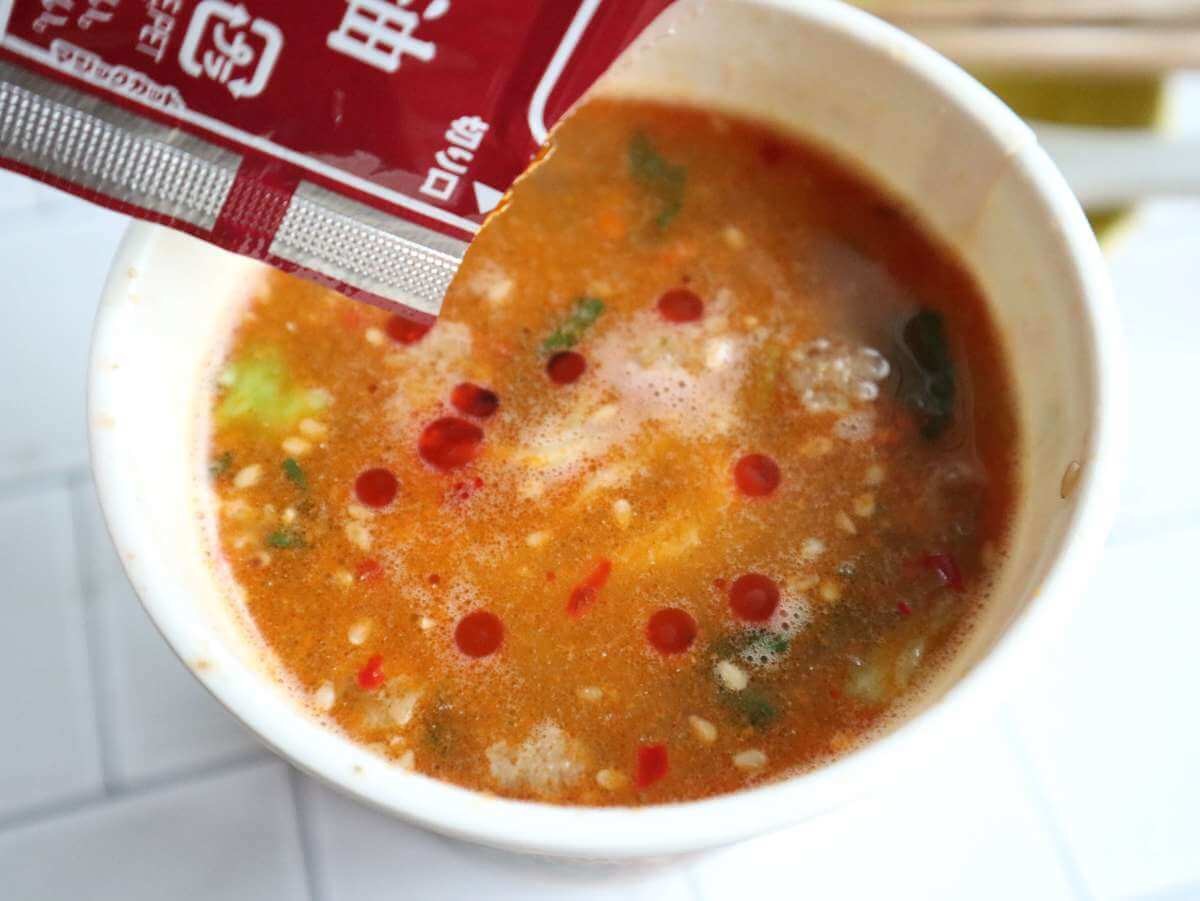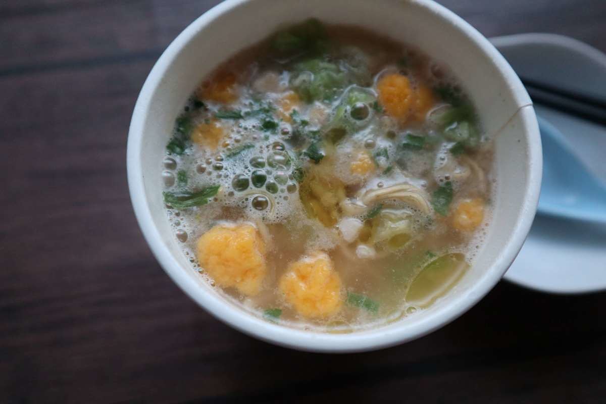 担々麺のスープといったら、がっつりとした濃厚な味わいが好みなんですが、こちらはいまひとつ。セブンイレブンの同じくPB商品の担々麺のスープが濃厚でコクがあるのでそれと比べてしまうと…物足りなさを感じてしまいます。