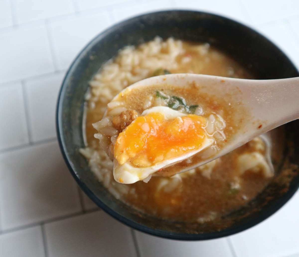 耐熱容器にごはんをいれて、スープをかけて、卵を落とします。黄身に楊枝で数か所穴をあけて、600Wの電子レンジで2分ほど加熱したら完成。