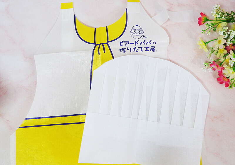 黄色い箱の中には、お子様用コック帽と紙製エプロンが各1つずつついてきます。コック帽も紙製ですが、かなり本格的な形をしていてびっくり。気分があがりそうです!