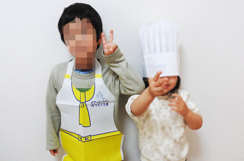 我が家には5歳の息子と3歳の娘がいますので、息子には紙製エプロンを、娘には帽子を装着することできょうだいケンカは回避。
