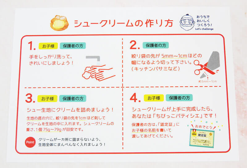 そんな折、目にとまったのがビアードパパの「ちびっこパティシエセット」。気軽にシュークリーム屋さん気分が味わえるのだとか。小さな子どもでも楽しめそうなので、買ってみました。