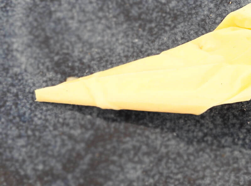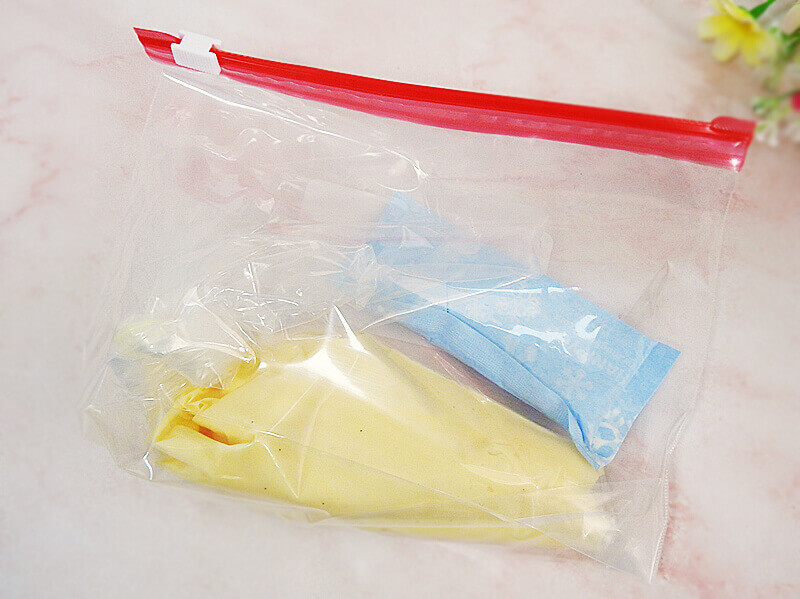 ジッパー付きの袋に入っているカスタードクリーム入り絞り袋を取り出して、先っぽをキッチンバサミなどで切ります。