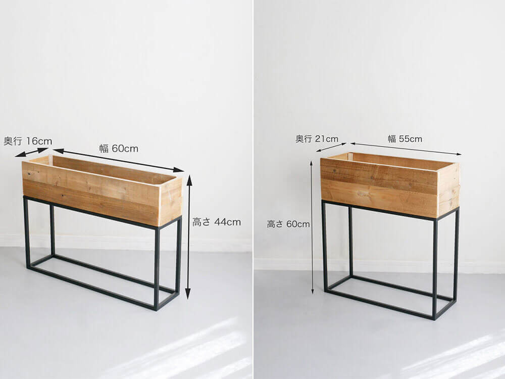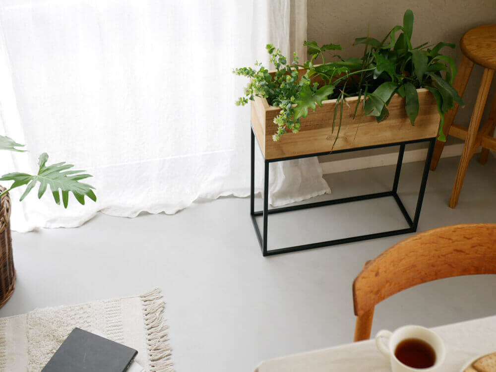 杉の木とアイアンからなる「【SPICE OF LIFE】レクトプランターボックススタンド」は、木目の温かさやアイアンのインダストリアルな雰囲気で大人のお部屋にマッチし、カフェ風インテリアのよう。