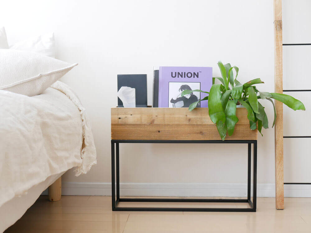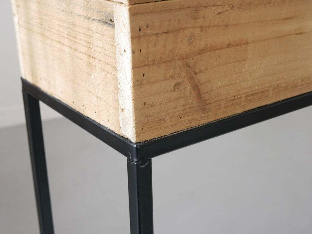 杉の木の素材感がそのまま感じられるので、当たり前のように植物との相性はピッタリ。それにアイアンの脚で、温かすぎない大人のモダンヴィンテージ感を添えられます。