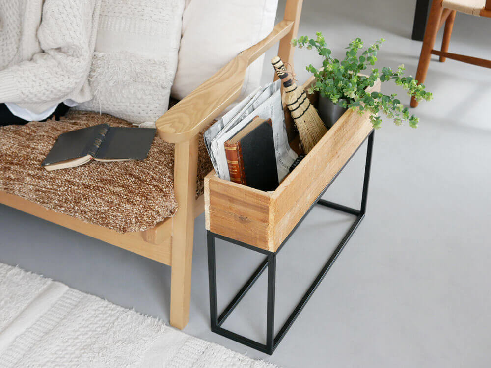 雑誌や新聞、リモコンやティッシュなどをガサッと入れるだけでも、なんだかステキに。箱型なので目隠しにもなりサイドから見ると、ゴチャ付きも隠せちゃう優れものです。
