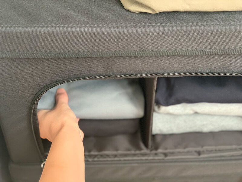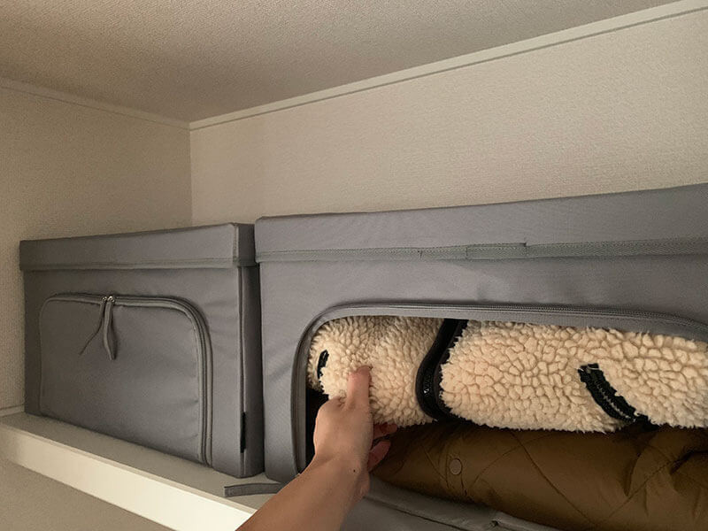 クローゼットの棚上に置いたままの状態で、ファスナーを開けて前から抜き取るだけ。